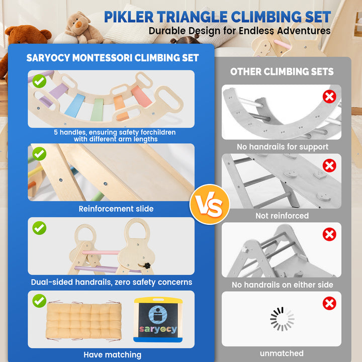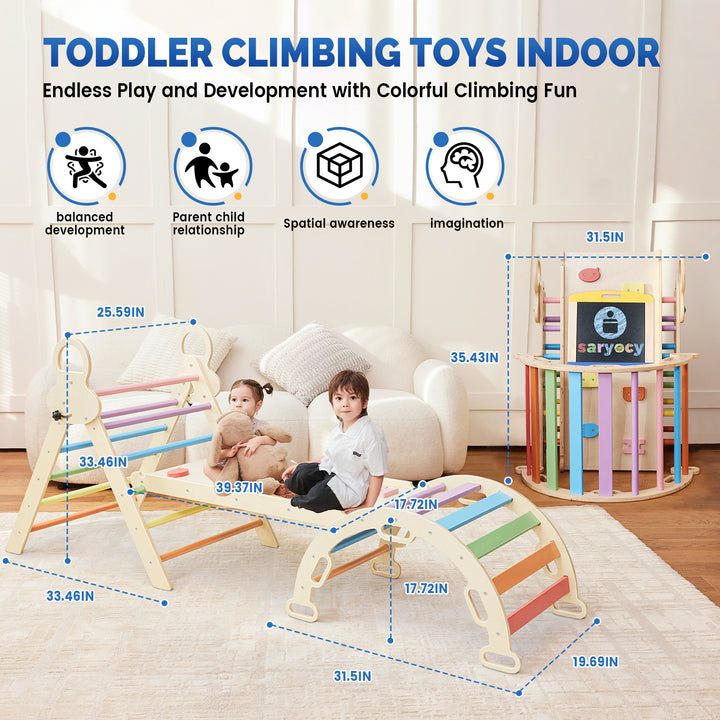 - Premium Wood: Pikler Triangle Set is made from natural wood with a load capacity of 190 lbs (86 kg). Suitable for kids aged 1-6, it adds warmth and color to any space. The toddler climbing toys indoor with a rainbow design enhances color recognition. Hand-polished finishes make it easy to clean, and maintain. Pikler triangle climbing set is perfect for indoor playset for toddlers 1-3, Enhances imagination and active fun
